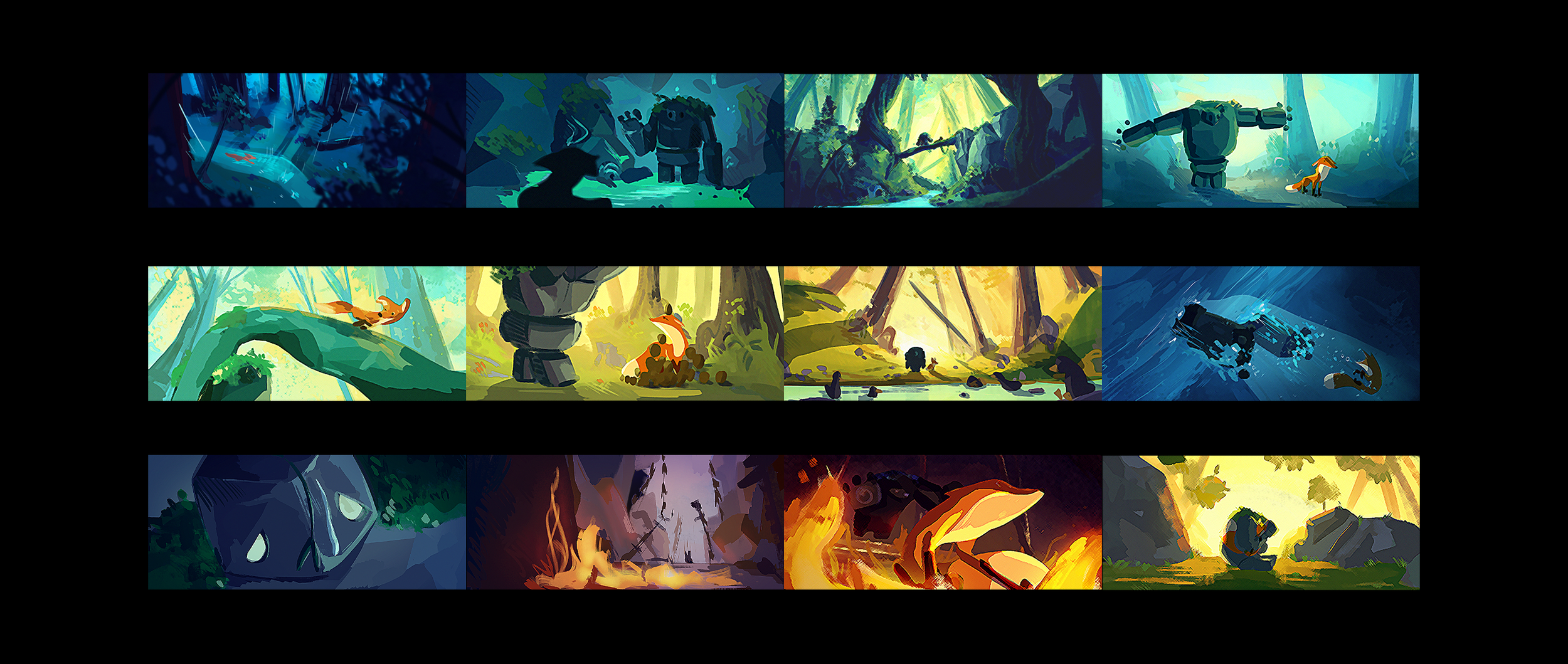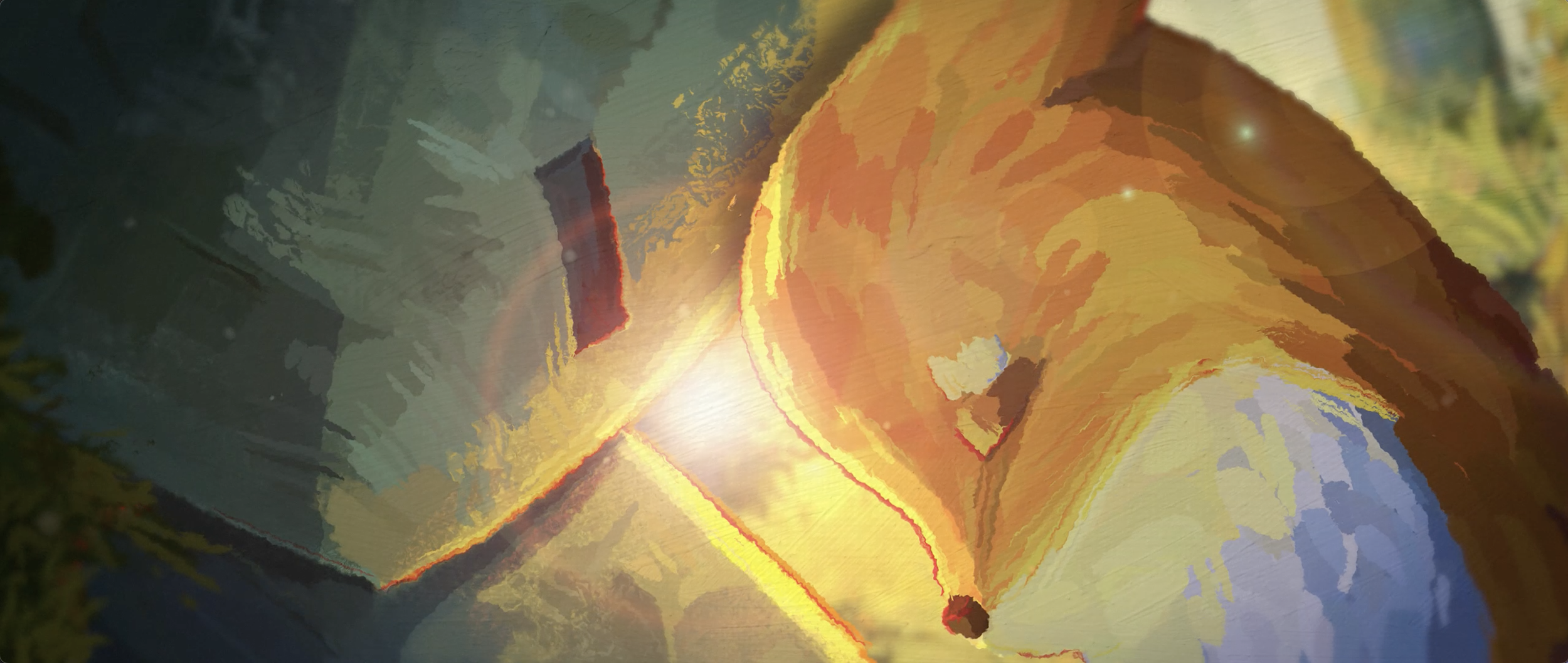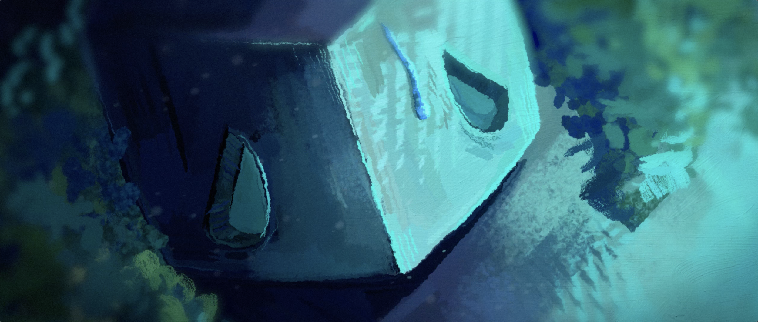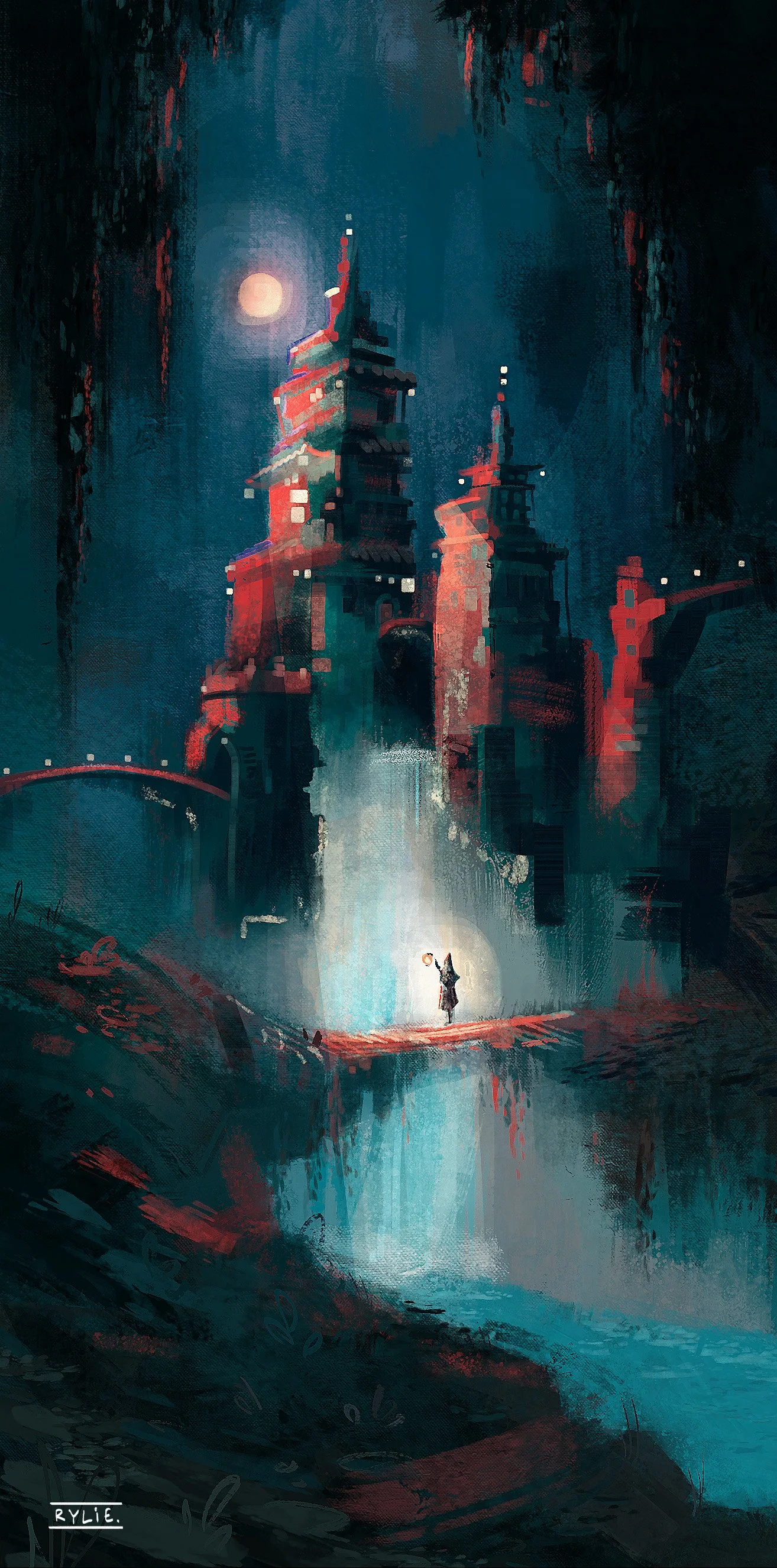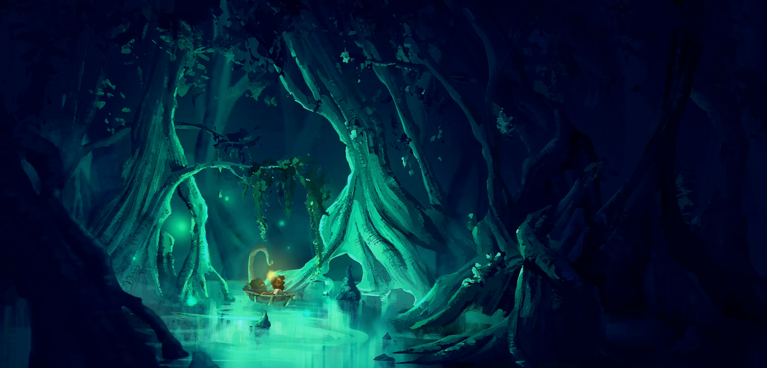 Illustration of a mystical forest with glowing trees and a person in a boat. The atmosphere is dark and enchanted, with teal and green hues illuminating the scene.