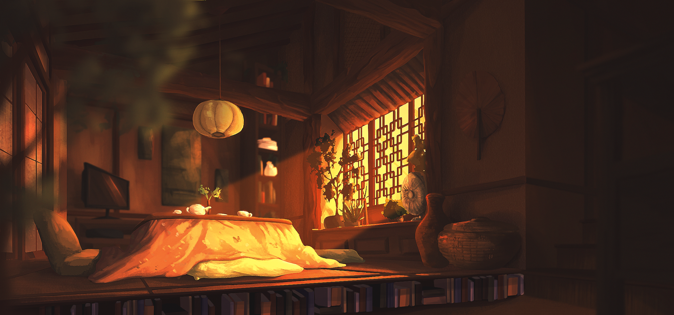 Cozy room with Japanese decor, including tatami mats, a kotatsu table with a blanket, cushions, a hanging lantern, and various plants. Golden sunset light streams through the shoji screen windows. View fullsize