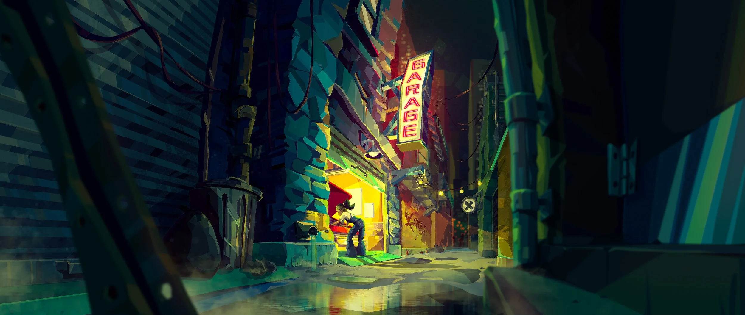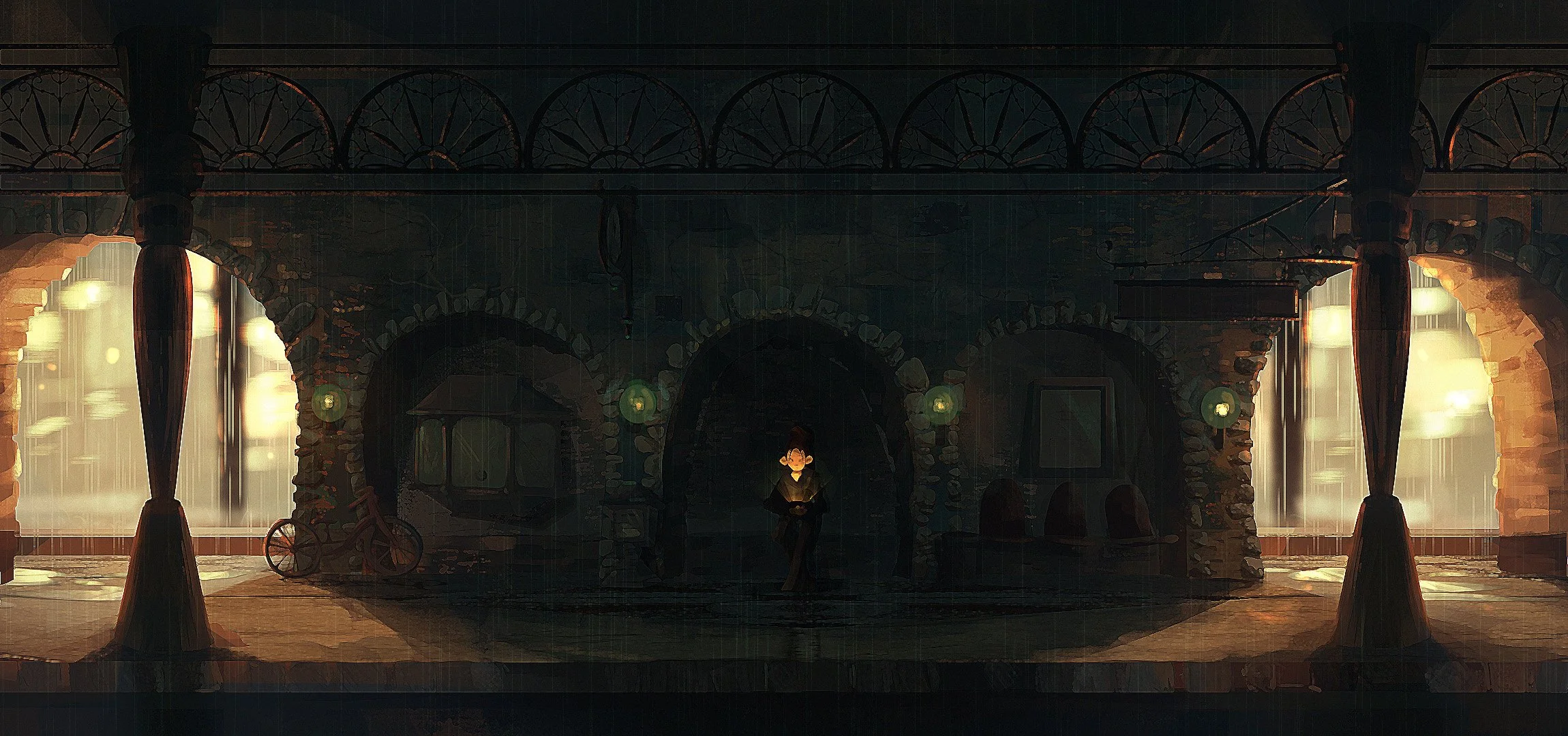 Dark, atmospheric alleyway with stone arches, illuminated by soft lighting from hanging lamps. A person is sitting under an archway, reading a glowing book. A bike is leaned against a wall.
