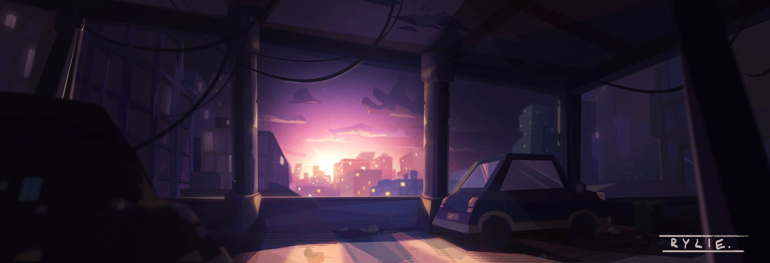 Digital artwork of a car in a dark parking structure with a glowing cityscape at sunset in the background. View fullsize