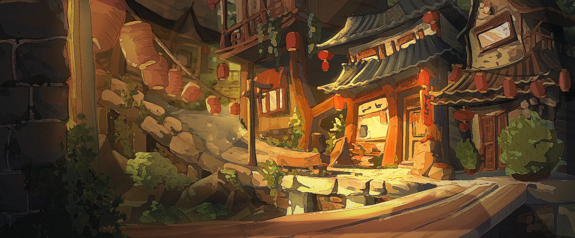 Illustration of an ancient Asian street with stone stairs, red lanterns, and traditional architecture.