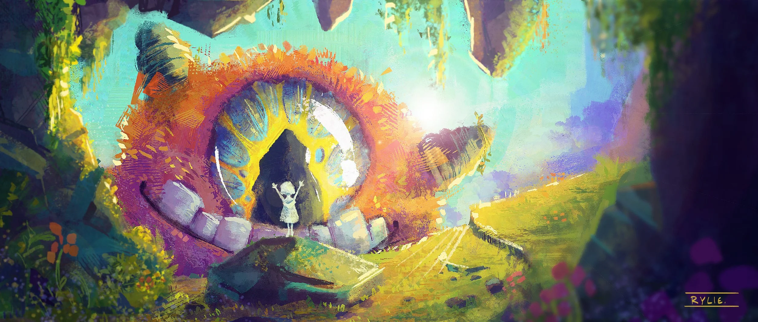 Illustration of a rural landscape with a dirt path, trees, and a field under a clear sky. "Rylie" signature in the corner.