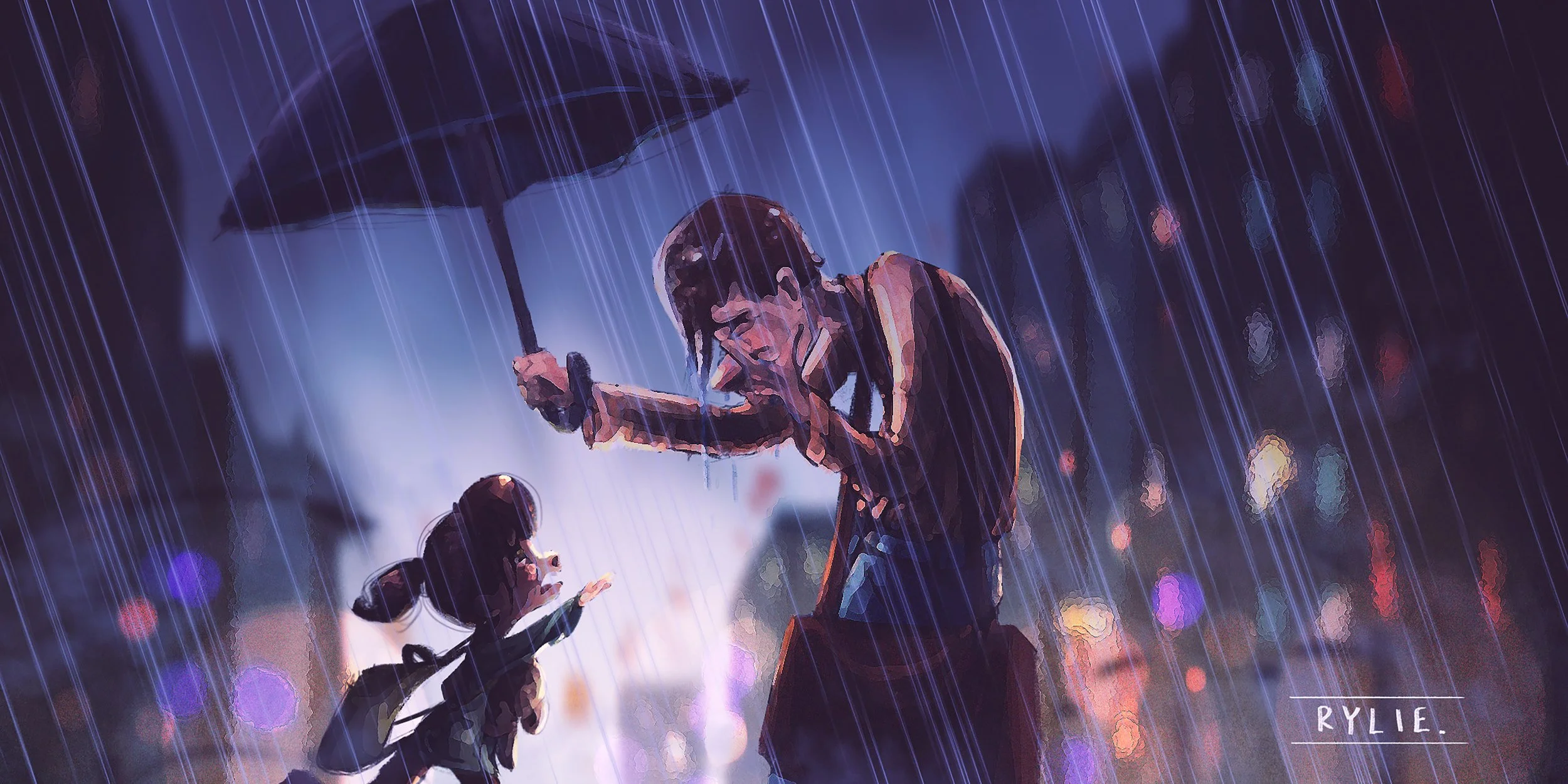 Digital art of a person sitting with a pet under a tree in a city street, illuminated by warm golden sunlight with tall buildings in the background.