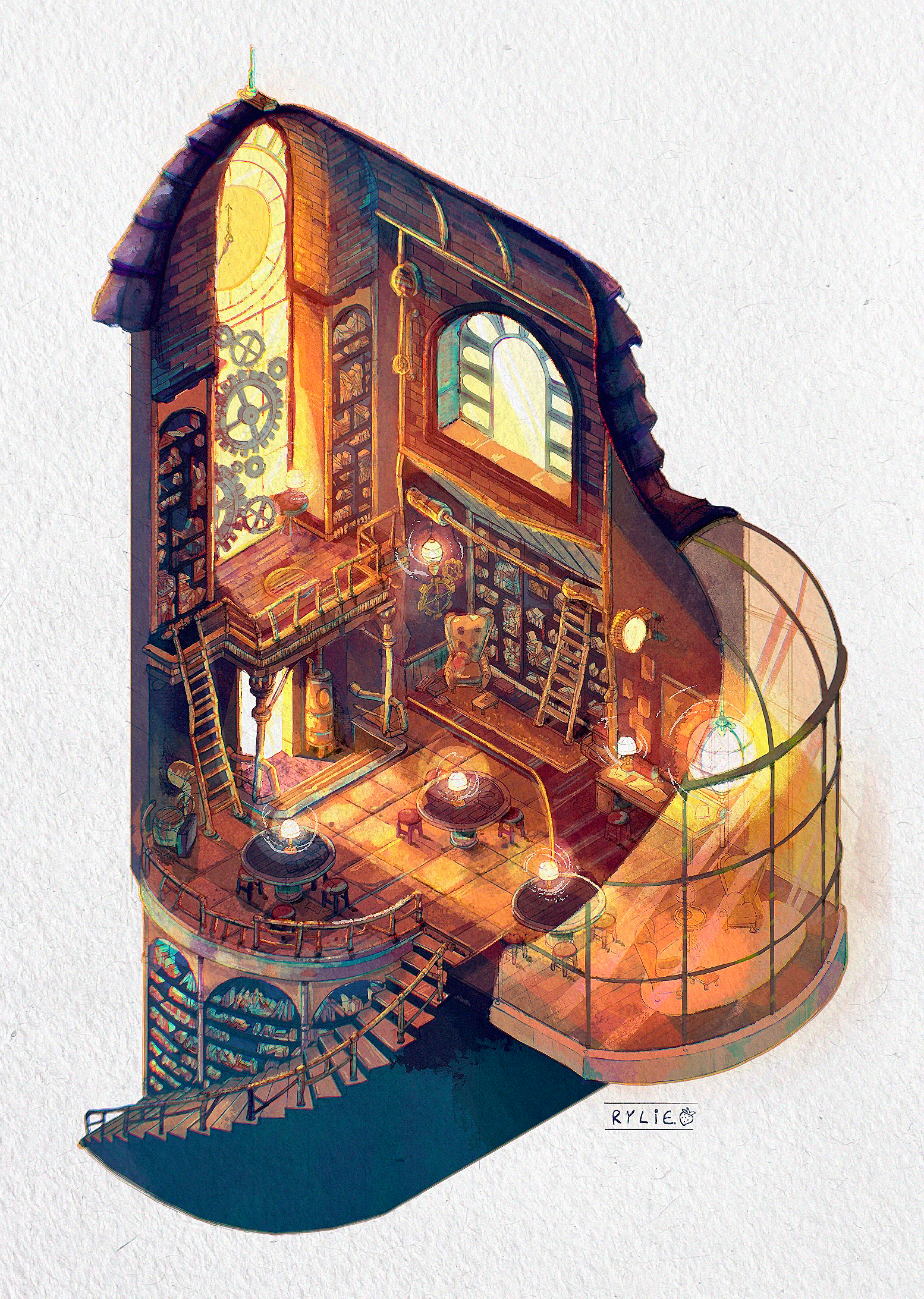 Illustration of a whimsical cottage called 'Meadow Cottage' with a thatched roof, surrounded by plants. Includes sketches of its front, side, and 3/4 views, with warm earth tones and artistic brush strokes. Labeled 'Rylie' at the bottom. View fullsize